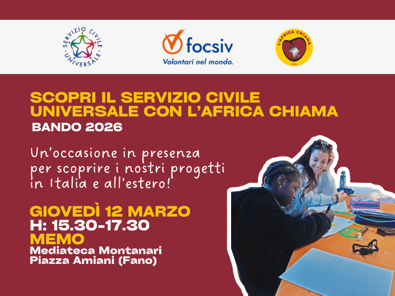 Nell’ambito del bando per il Servizio Civile Universale 2026, L’Africa Chiama, organizza un incontro in presenza a Fano (PU) il 12 marzo dalle 15.30 alle 17.30 per un evento dedicato alla presentazione del Bando SCU 2026 e ai suoi progetti in Italia (Fano) e in Kenya, Tanzania e Zambia.