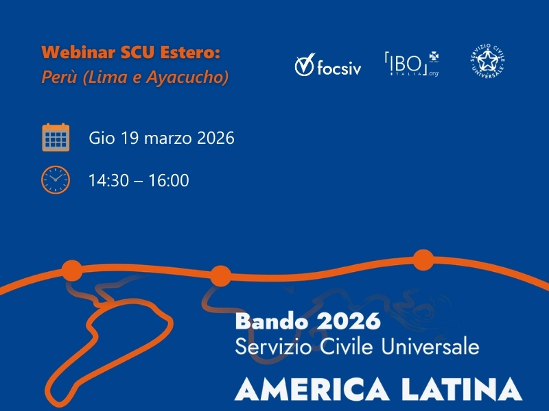 Nell’ambito del bando per il Servizio Civile Universale 2026, IBO, organizza un incontro online giovedì 19 marzo alle 14.30 per presentare i progetti SCU in Perù (Lima e Ayacucho).