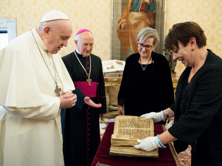 Comunicati stampa Sidra torna nella città santa per cristiani iracheni con il Santo Padre Il Libro Sacro di Qaraqosh riportato in Iraq dal Papa 7 Marzo 2021