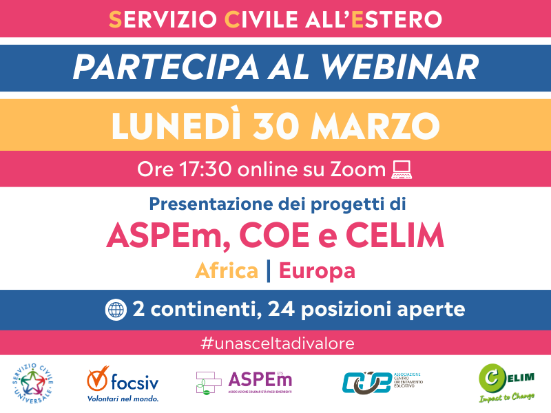 Nell’ambito del bando per il Servizio Civile Universale 2026, ASPEm, COE e CELIM, organizzano un incontro online lunedì 30 marzo alle 17:30 per presentare i loro progetti in AFRICA E EUROPA