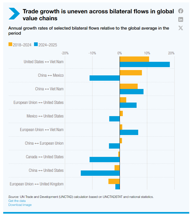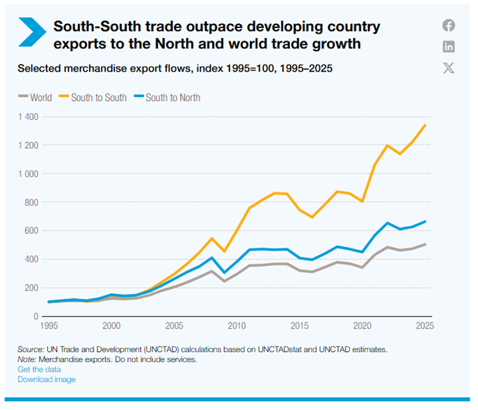 Le esportazioni di merci South–South sono passate da circa 0,5 trilioni di dollari nel 1995 a 6,8 trilioni nel 2025. Oggi, il 57% delle esportazioni dei paesi in via di sviluppo va verso altri mercati in via di sviluppo, guidato dalle catene del valore regionali asiatiche. Anche Africa e America Latina stanno rafforzando i legami Sud-Sud. Un commercio interregionale più profondo può aiutare a compensare la domanda più debole nelle economie avanzate e aumentare la resilienza.